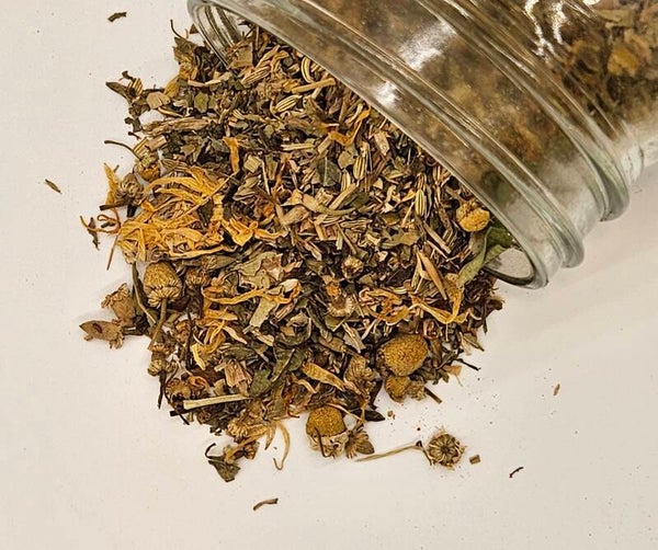 Chamomile, passion flower, lemon balm, oat straw, linden flower, lemon verbena, fennel, calendula, and nutmeg.